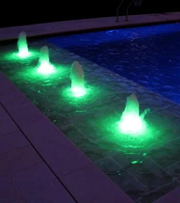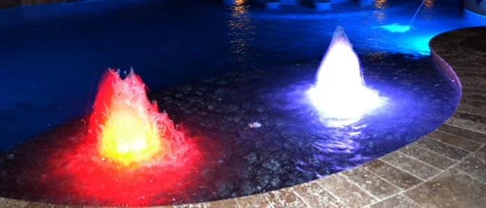 Lighted bubblers are a distinct feature used in various designs. Bubblers can be used in pools, spas, ponds, fountains, or other aquatic areas. From multiple bubblers of the same color, to multi colored bubblers, to a single illuminated feature, it is a feature that is sure to catch your eye.