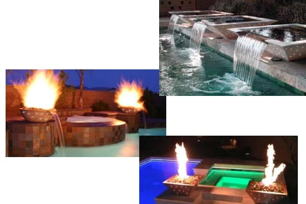 Illuminated water spills and fire bowls use the elements, while subtly highlighting the bases with fiber optics. Water spills and fire bowls are often combined with other features creating a comprehensive design.